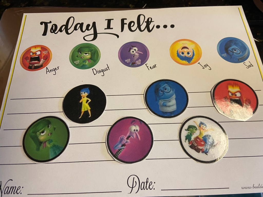 I had them write out how the felt, in age appropriate ways. ‘J’ at 7 was able to write out sentences, while his sister at 4, copied which feeling she aligned with and one word that caused her to feel that way. They both picked Joy and considering it was Monday, I thought that was a great way to kick off their week!
