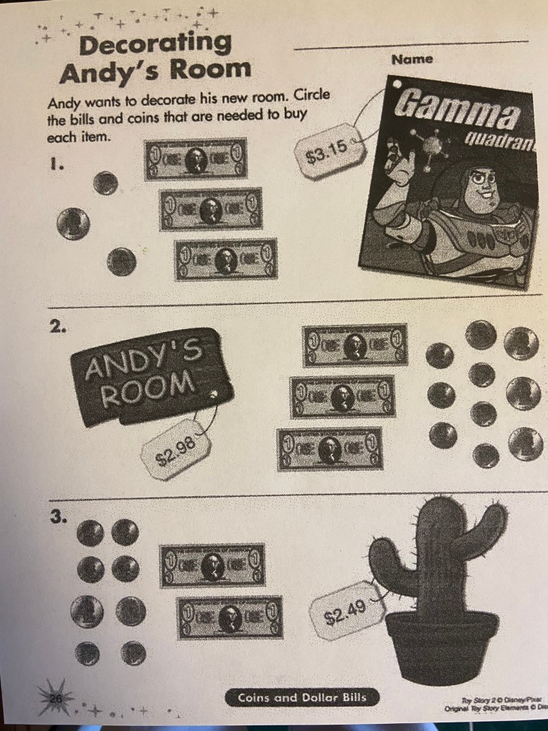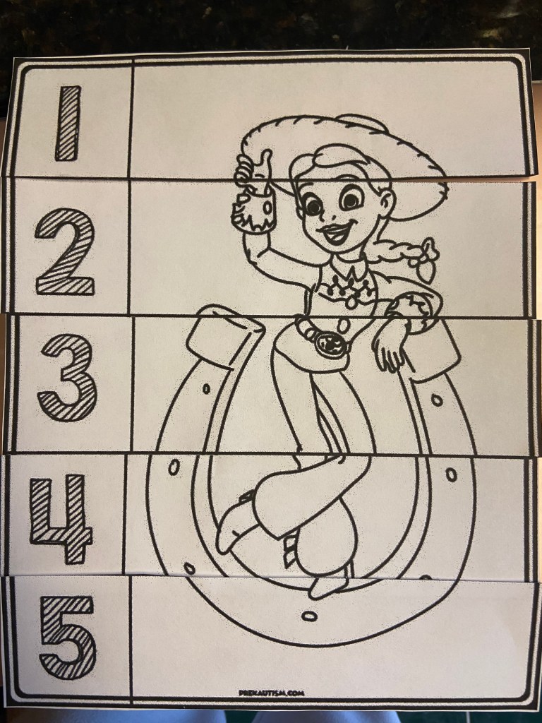 Next up, I snuck in some age appropriate Math! ‘J’ practiced money with a Toy Story worksheet and his sister worked on a Toy Story puzzle to practice number order. I built on both a bit by changing up the number order for the puzzle and having ‘J’ use pretend money to pay for the items on the worksheet.