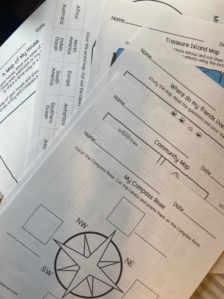 I found these awesome worksheets from clevelearner.com via Pinterest. They got to review directions of a compass and started to working on reading a map. Would a map discussion be complete if they weren’t able to create their own treasure map?