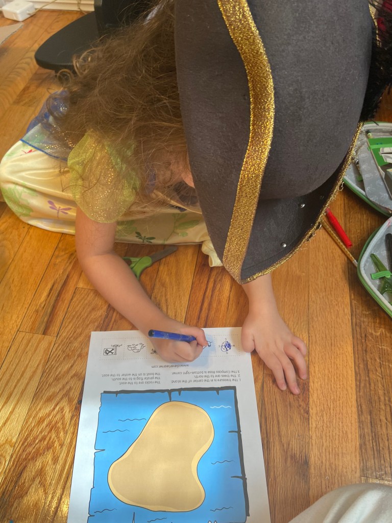 Since they were already dressed as pirates and had a treasure map, why not create a whole island? They got to work with crayons, Play-Doh, figures and anything else they could find!