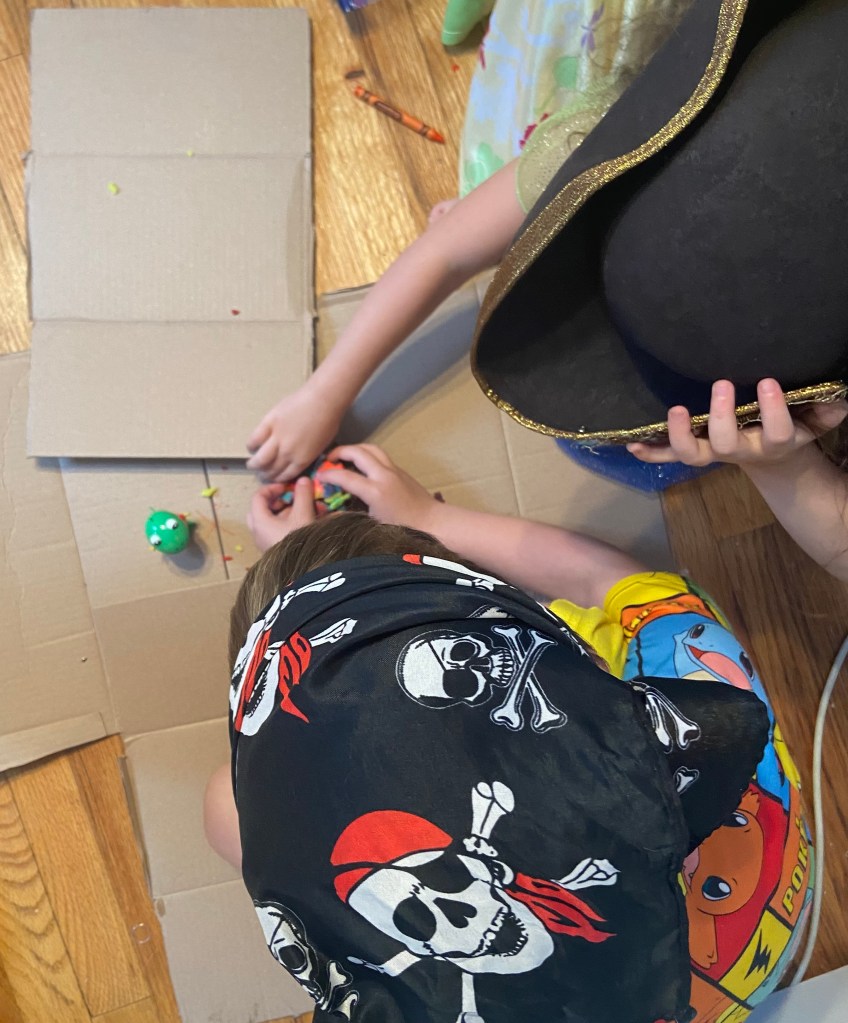 They decided to complete the treasure map while dressed as pirates. I took apart an old box and planned to have them create a city out of it. They had bigger plans!